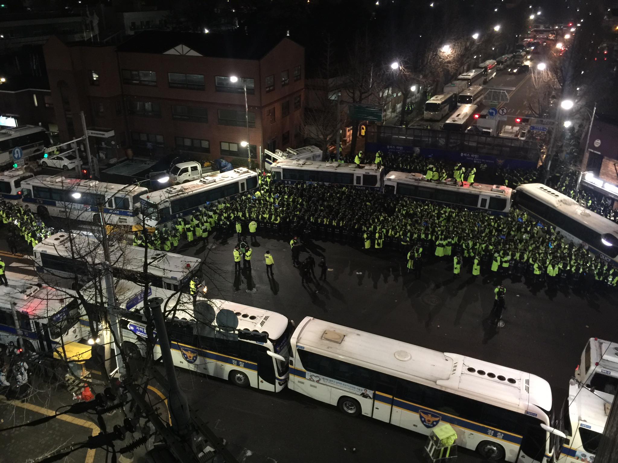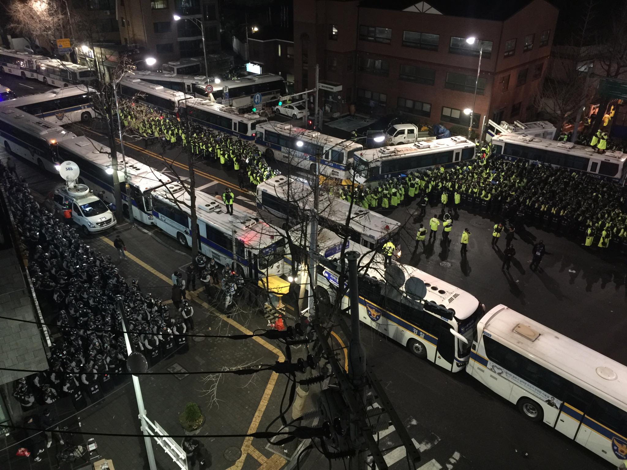 청운효자동 주민센터 앞, 대규모 경찰 병력 이동, 장비 이동이 진행 중이다. 이중으로 벽이 투텁게 만들어진다. 밖에서 안을 볼 수 없는 구조로 진을 쳐 보이는 곳으로 가보았다. (20:29)
