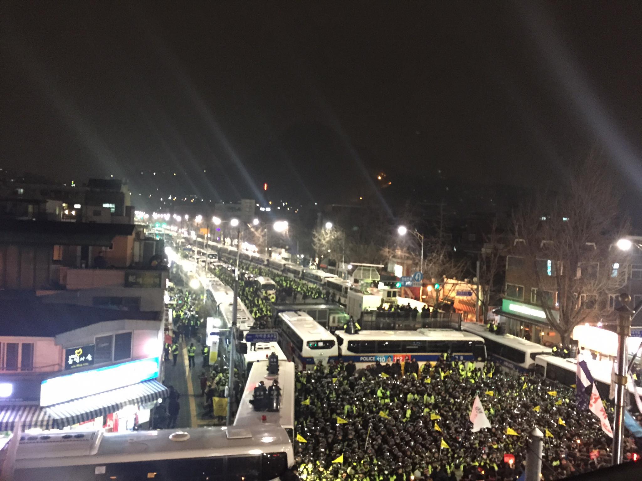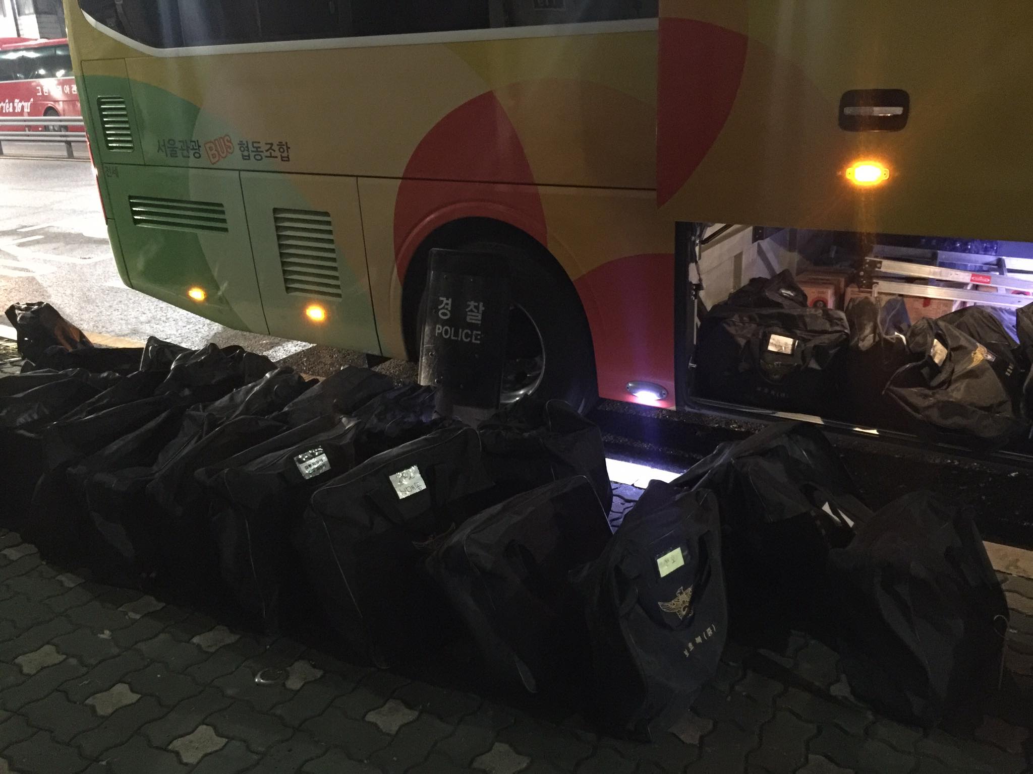 전국에서 동원된 끝도 없는 관광 버스 안에는 경찰 장구들이 있다. 역시 경계가 소홀하다. (20:05)